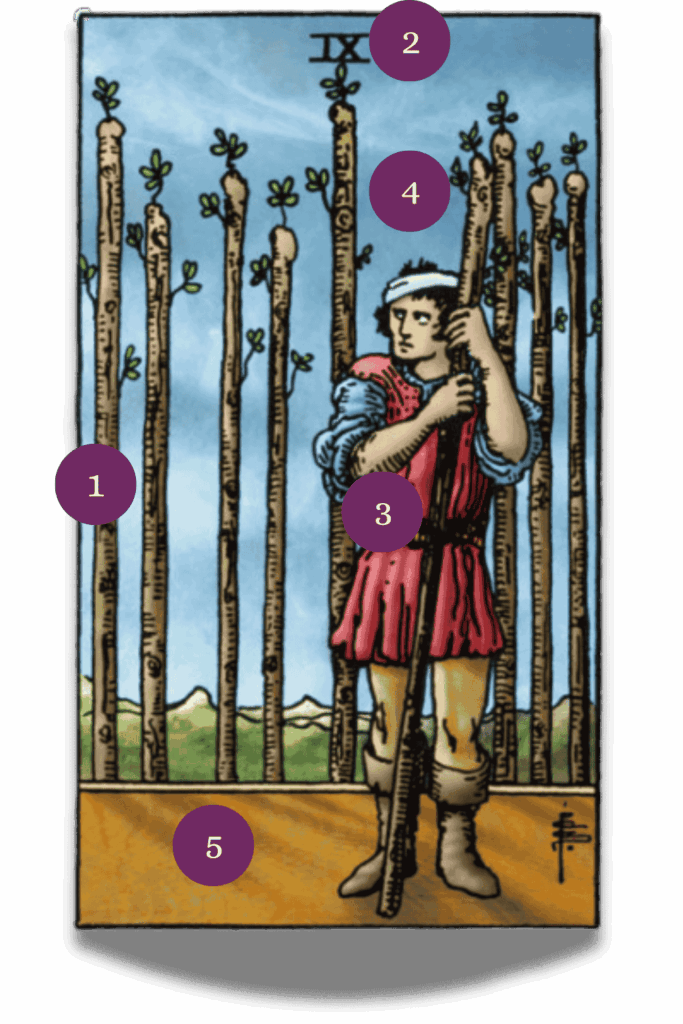 Het thema van de kaart Kleine Arcana Staven negen is stilstaan bij hoever je bent gekomen, zowel je successen als je falen.