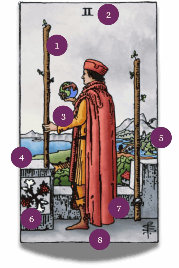 De figuur op de kaart houdt in zijn rechterhand een wereldbol, de aarde. Hij heeft de wereld in zijn handen (je zou gezien de hoogte ook kunnen zeggen ‘de wereld ligt aan zijn voeten’). Met aarde als element van concreetheid, lijkt dit te zeggen dat alles mogelijk is, maar in zijn linkerhand houdt hij slechts één staf vast.