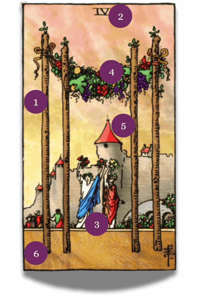 Het thema van de kaart Kleine Arcana Staven vier is stabiliteit door samenwerking.