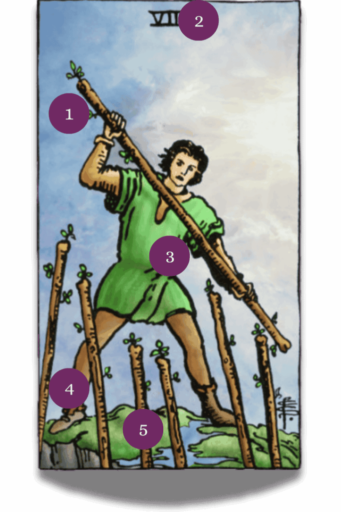 Het thema van de kaart Kleine Arcana Staven zeven is bewust mogen worden van waar je mee bezig bent en wat je eigenlijk wilt.