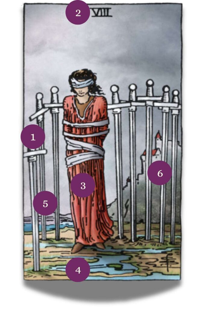 Het thema van de kaart Kleine Arcana Zwaarden acht is commitment, het in vertrouwen verbinden aan het hier en nu.